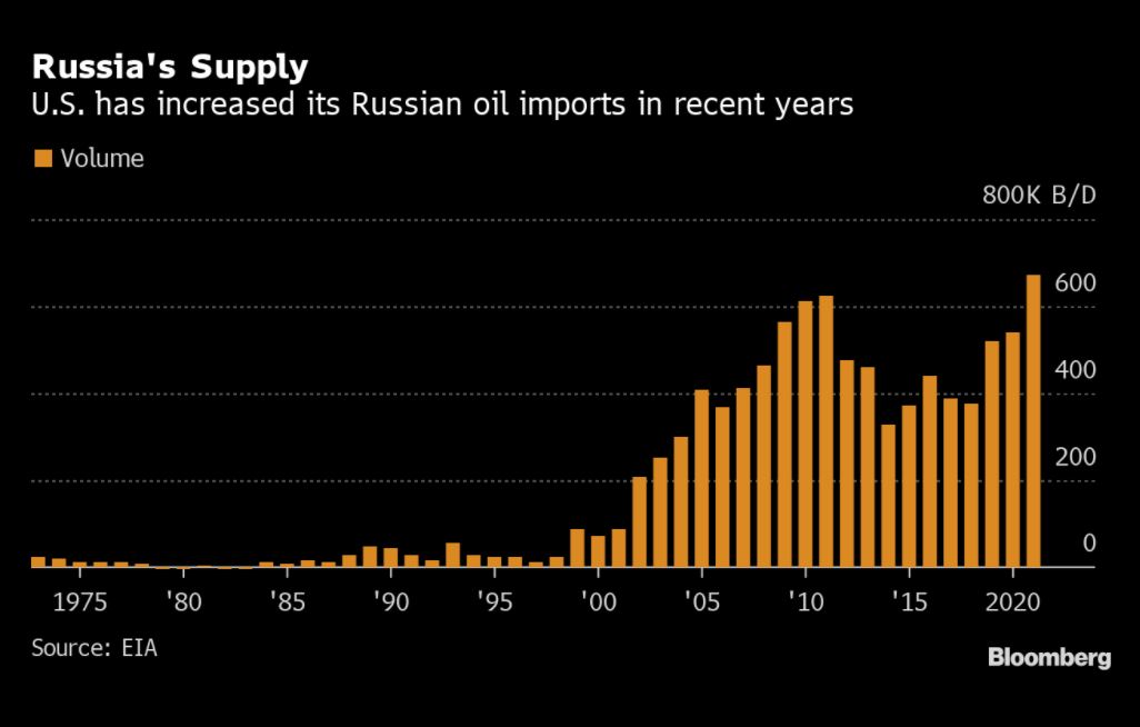 The U.S. Imports Record Share Of Russian Oil Despite ... As per Bloomberg calculations, the United States imported on average 538,000 barrels per day (bpd) of oil and oil products from Russia last year. This was higher than the average American imports...